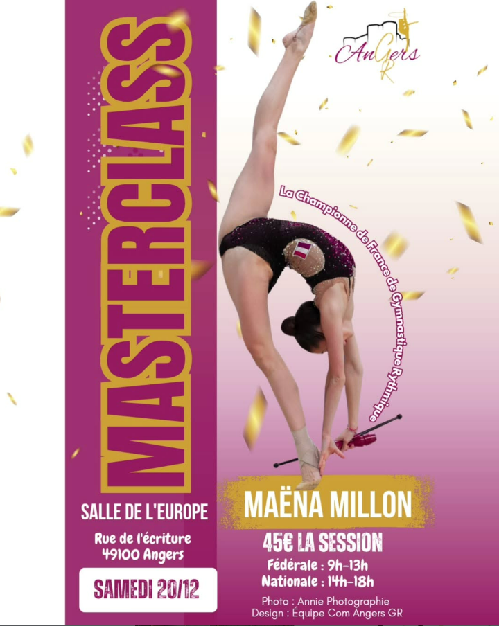 Angers GR est ravi d’accueillir Maëna Millon, jeune gymnaste rythmique talentueuse, sacrée championne de France 2025 en concours général —🇫🇷 une athlète de haut niveau, connue pour sa souplesse, son élégance et son expressivité sur les praticables. Une occasion unique de s’entraîner à ses côtés et de bénéficier de son expertise ! 🤸♀️💫
